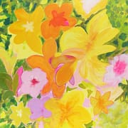 Depuis que j’ai su me reconnecter à mes sources intérieures, à ma „demeure intérieure féminine“, la créativité jaillit de mon être … Mes toiles expriment tout un monde de légèreté et de joie, de béatitude et de félicité, de danse, d’amour, de féminité, de profonde communion, de gaîté et de créativité.